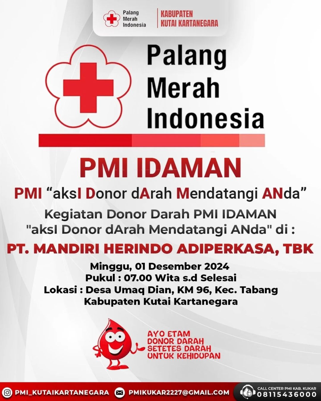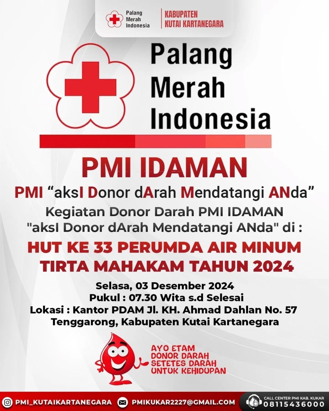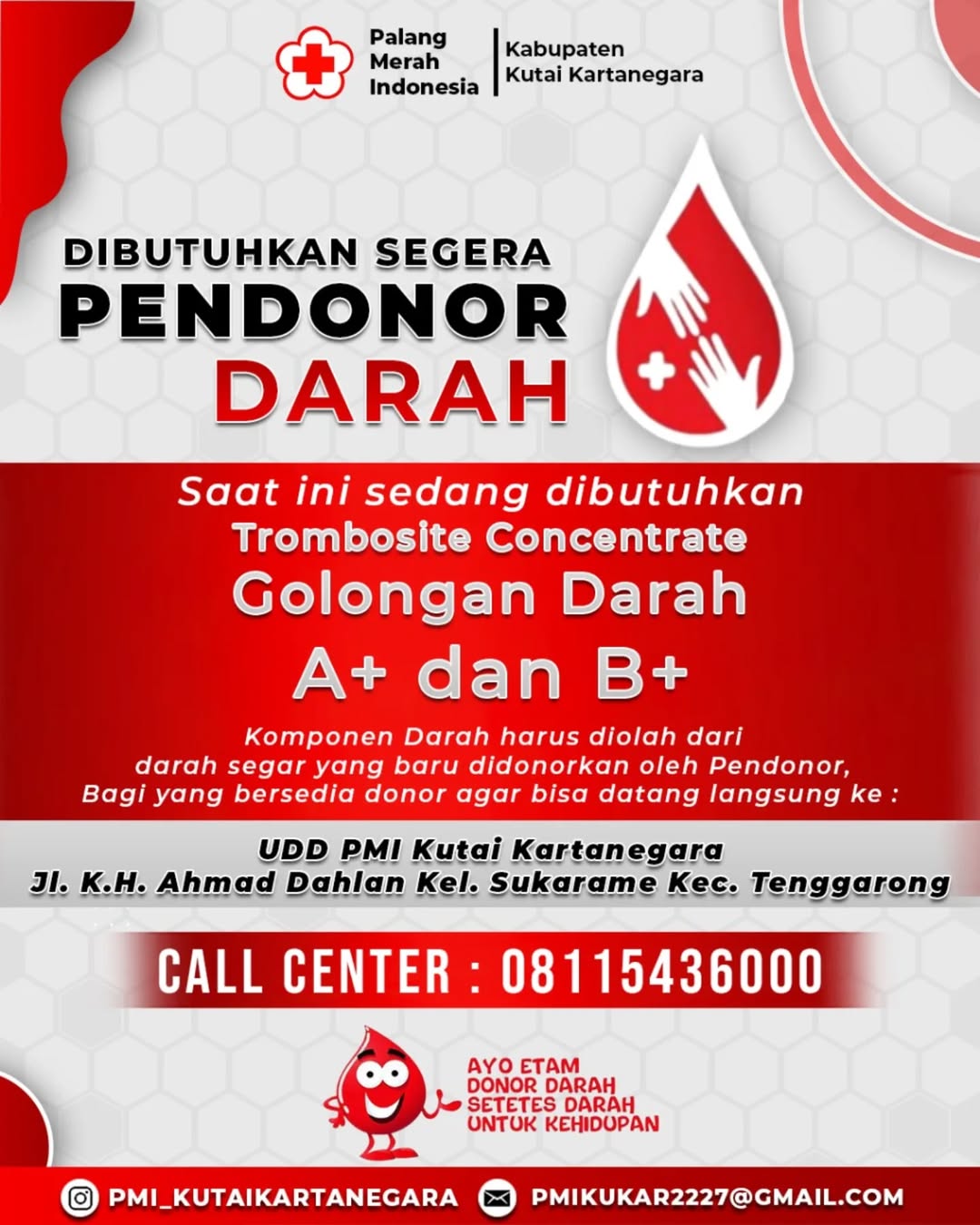 Bagi yang akan mendonorkan darahnya agar bisa datang langsung ke Unit Donor Darah (UDD) PMI Kab. Kutai Kartanegara
