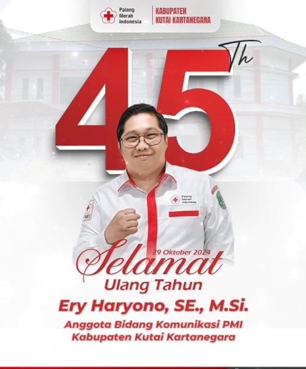 Keluarga Besar Palang Merah Indonesia Kabupaten Kutai Kartanegara mengucapkan Selamat Ulang Tahun yang Ke-45 untuk Bapak Ery Haryono, SE., M.Si. Anggota Bidang Komunikasi PMI Kabupaten Kutai Kartanegara